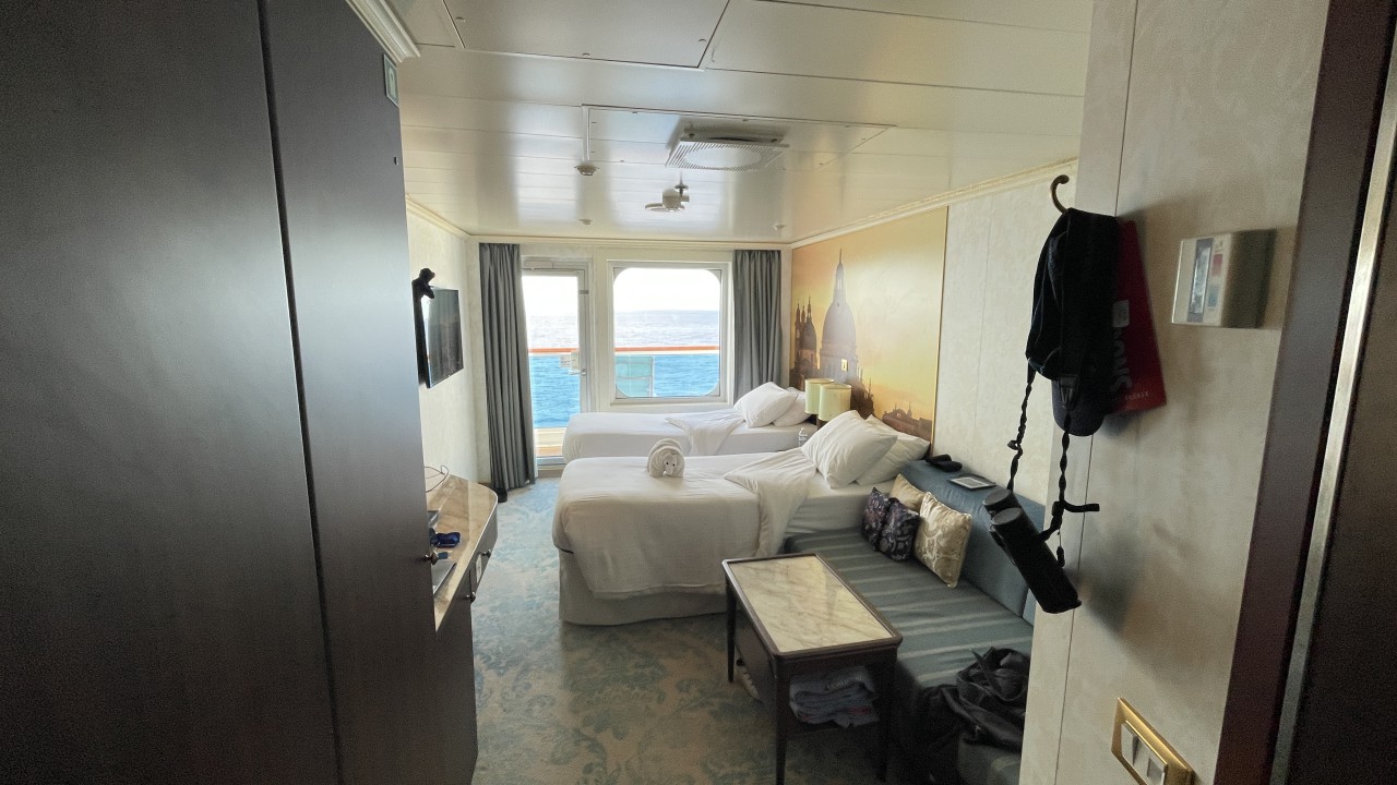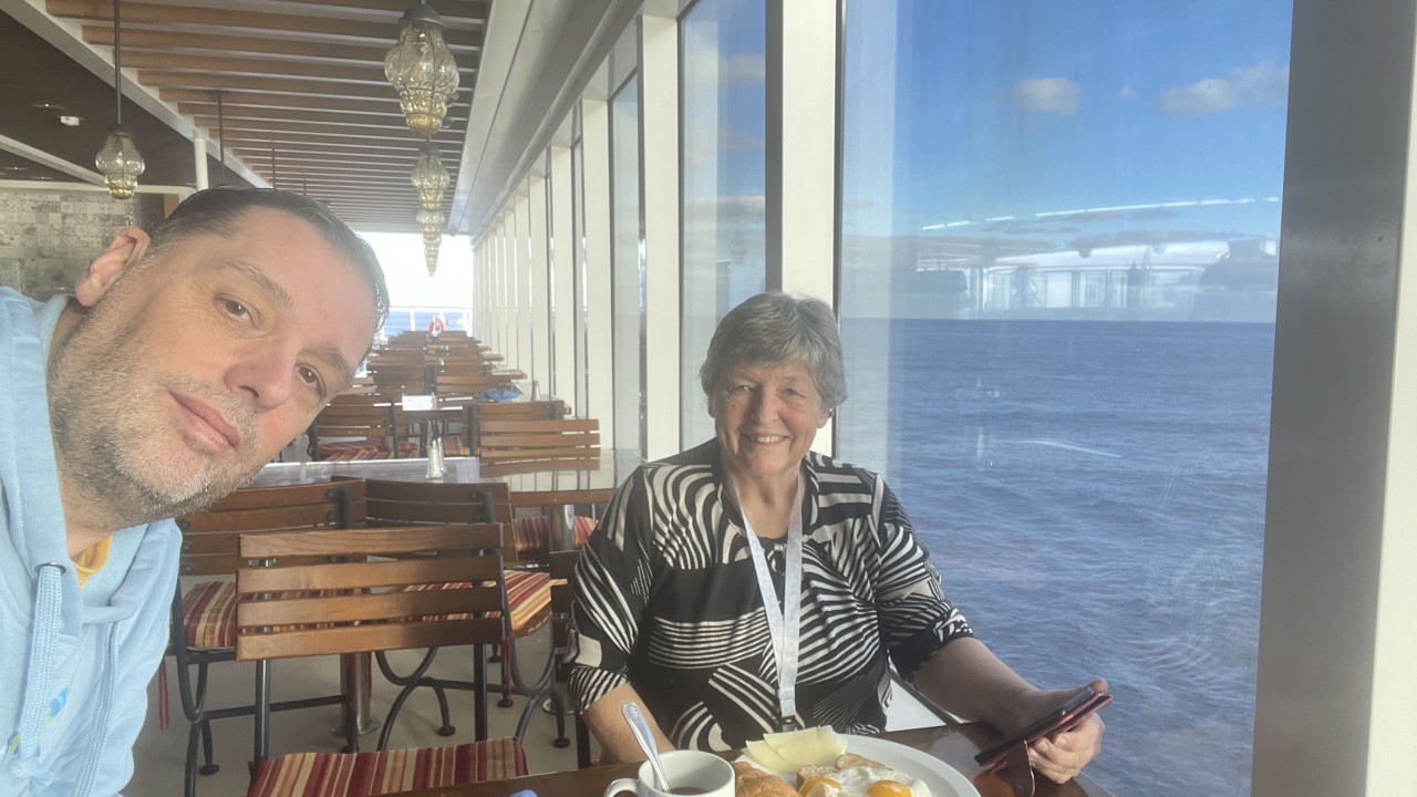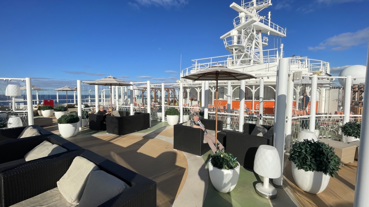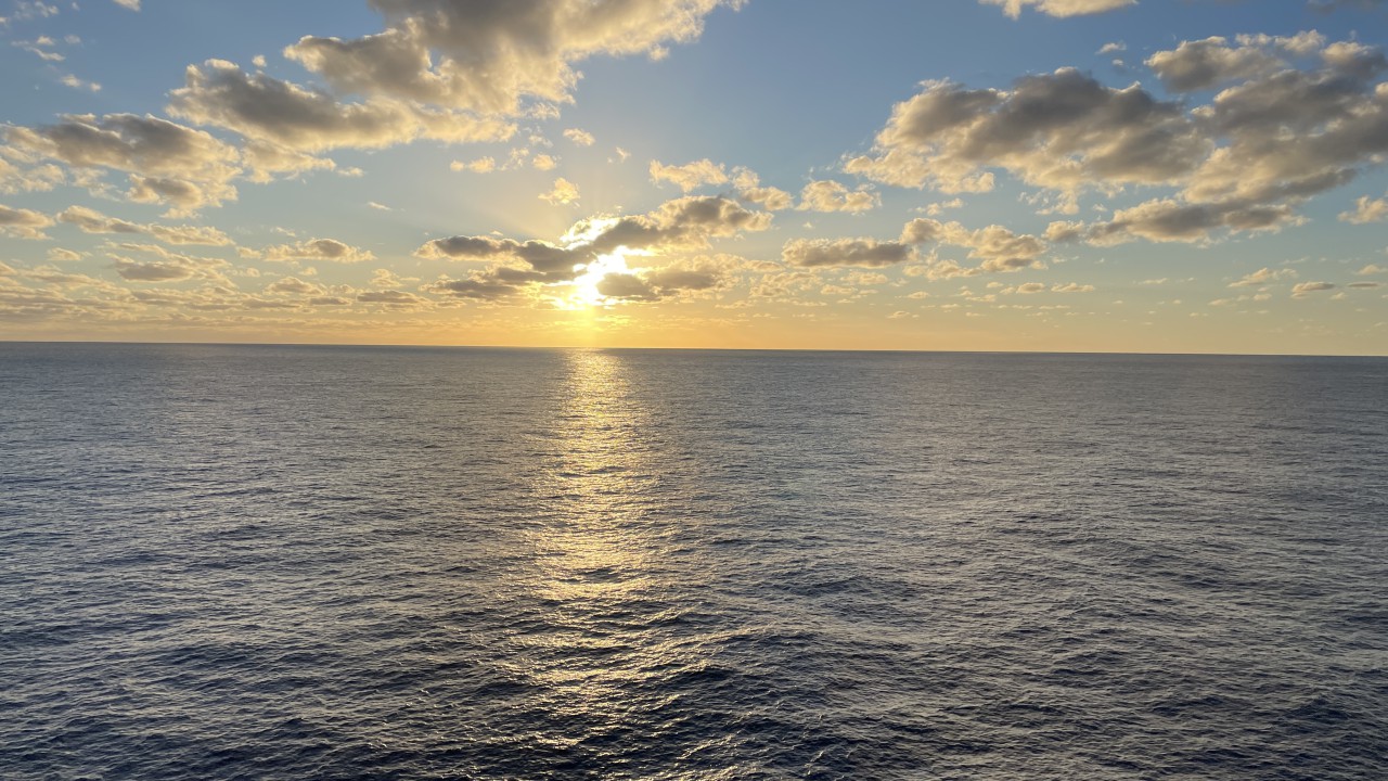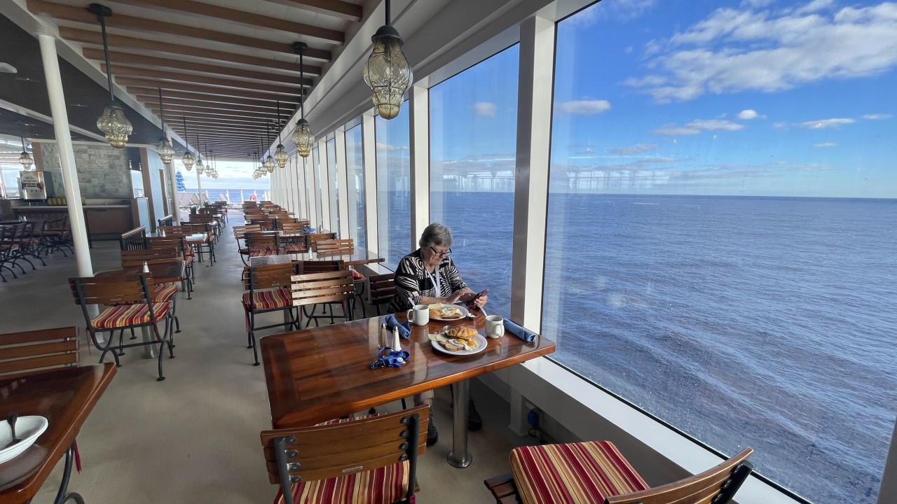 Dag 5 en wederom een zeedag. We moeten nogal wat zeemijlen afleggen vanaf New York naar onze eerste stop, St. Thomas op de Amerikaanse Maagdeneilanden. Maar we merken dat we de goede kant op gaan, want de temperatuur is aan het oplopen. Daar we gisteren nog rond het vriespunt hadden een ijskoude wind, was het vanochtend al een heel stuk warmer. Zo warm zelfs dat we al buiten hebben ontbeten. We hadden toen nog wel de trui aan, maar die is nog geen uur na het ontbijt omgeruild door een t-shirt en korte broek. De jassen hebben we nu zelfs al in de koffer zitten, want die hebben we pas weer in Nederland nodig.