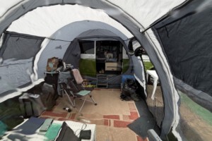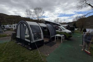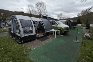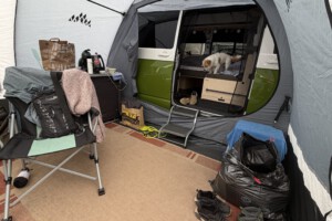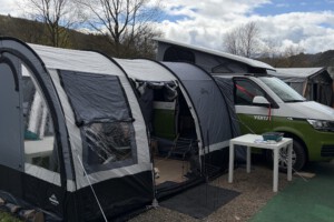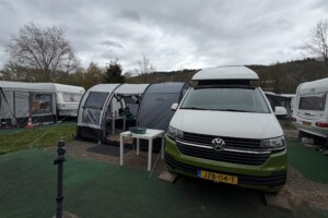 Gisteren dus een eerste poging gedaan: camper mooi horizontaal, eigenlijk precies zoals vroeger de caravan stond. Zag er op zich prima uit, maar de voortent dacht daar toch net even anders over. Die stond niet lekker, we weten niet precies wat, maar het was het gewoon nét niet.