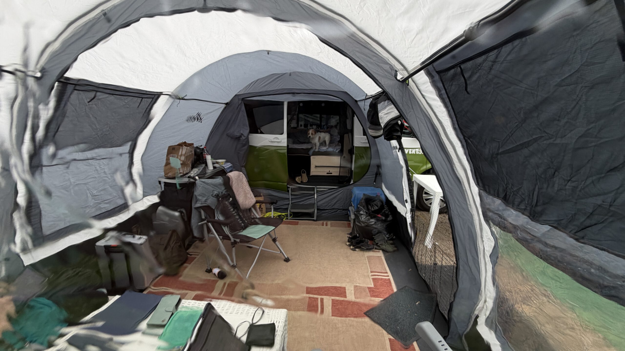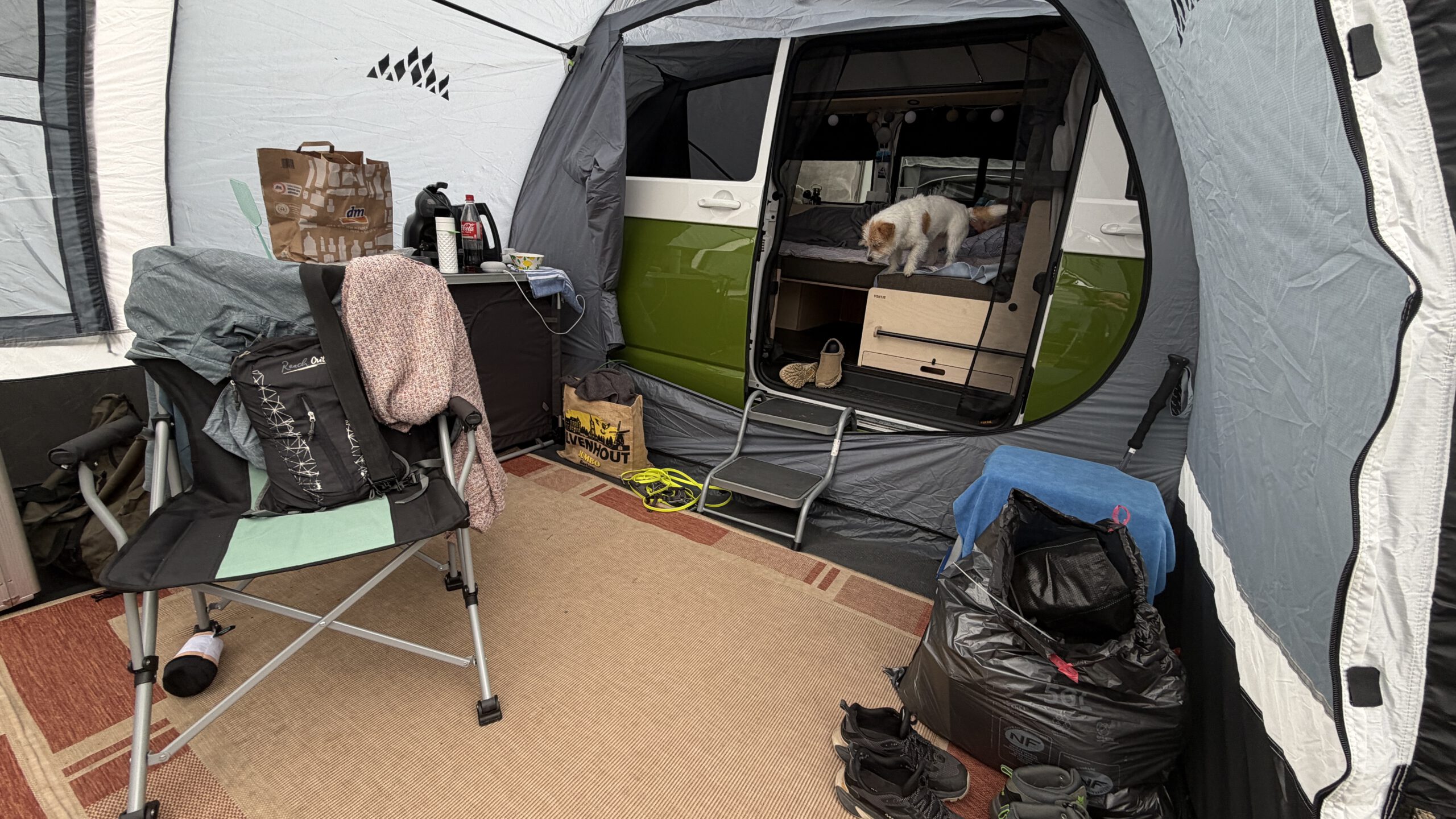 Gisteren dus een eerste poging gedaan: camper mooi horizontaal, eigenlijk precies zoals vroeger de caravan stond. Zag er op zich prima uit, maar de voortent dacht daar toch net even anders over. Die stond niet lekker, we weten niet precies wat, maar het was het gewoon nét niet.