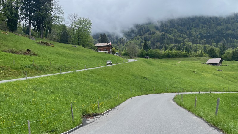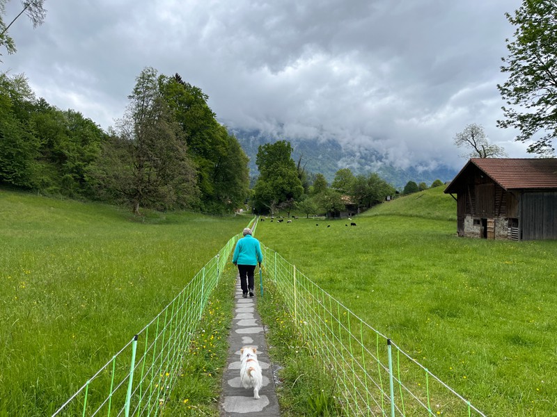 Geen plannen gemaakt dus vanochtend eerst maar eens op ons gemak ontbijten. Met een goede oven (met stoomfunctie) krijg je de afbakbroodjes alsof je ze vers uit de bakkerij krijgt. Het miezer een beetje, maar de vooruitzichten zien er goed uit, dus we maken de wildste plannen voor de middag. Uiteindelijk zijn er 4 met de bus naar Interlaken gegaan, 2 en een hond zijn gaan wandelen en 1 is er gaan mountainbiken. Het weer is inderdaad erg opgeklaard, het is droog en ook de temperatuur gaat merkbaar omhoog.
